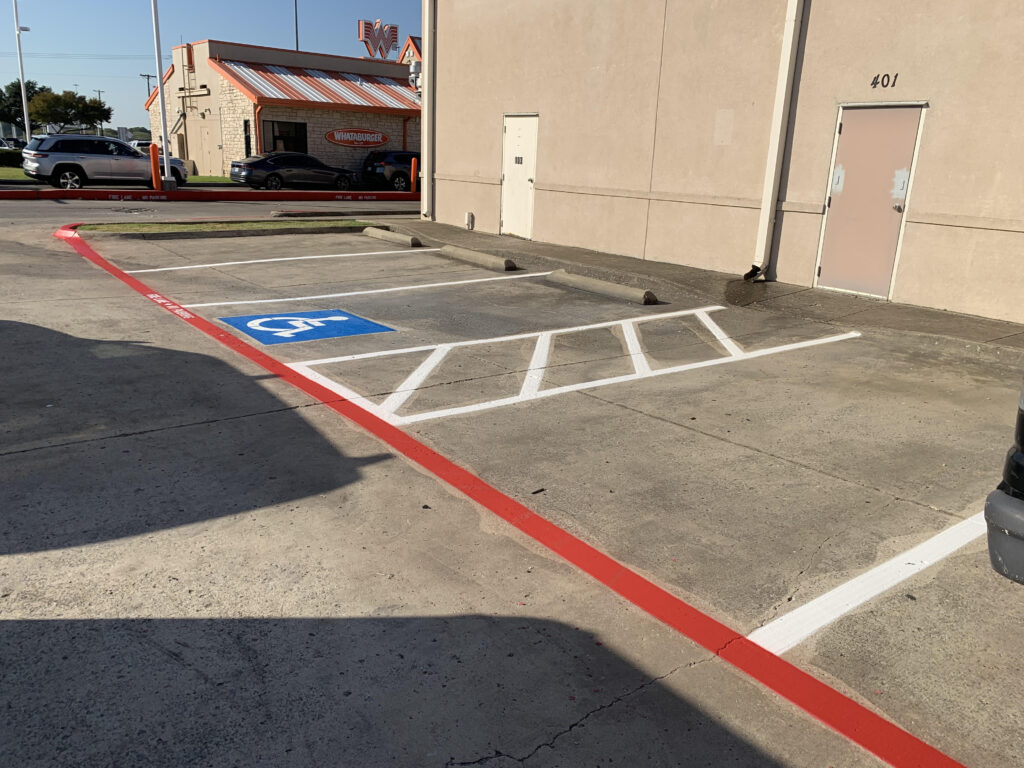 - Fire Lanes: Dallas fire codes require clearly marked fire lanes with red curbs and “FIRE LANE – NO PARKING” stenciled in white at regular intervals.
